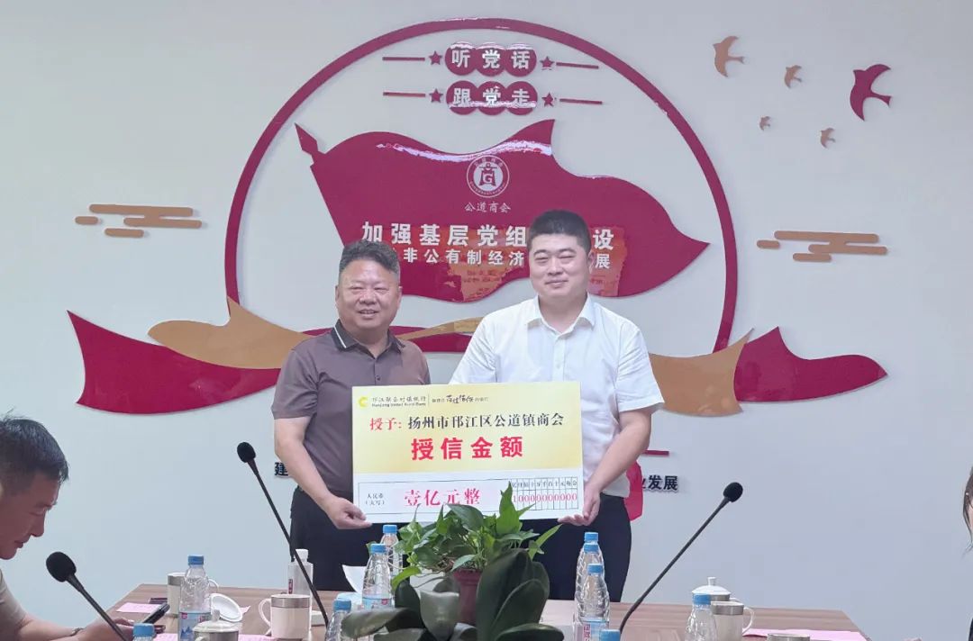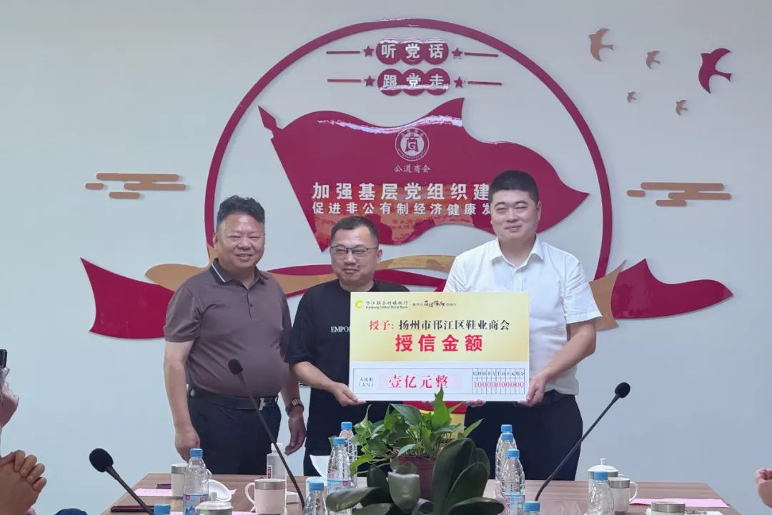 在热烈的掌声中,活动迎来了激动人心的签约授牌和授信仪式。邗江联合村镇银行党支部分别与邗江区鞋业商会党支部、公道镇商会党支部签订共建协议并授牌,标志着三方合作正式启航。随后,银行向公道镇商会和邗江区鞋业商会分别提供 1 亿元集体授信,为企业发展注入强劲资金动力。