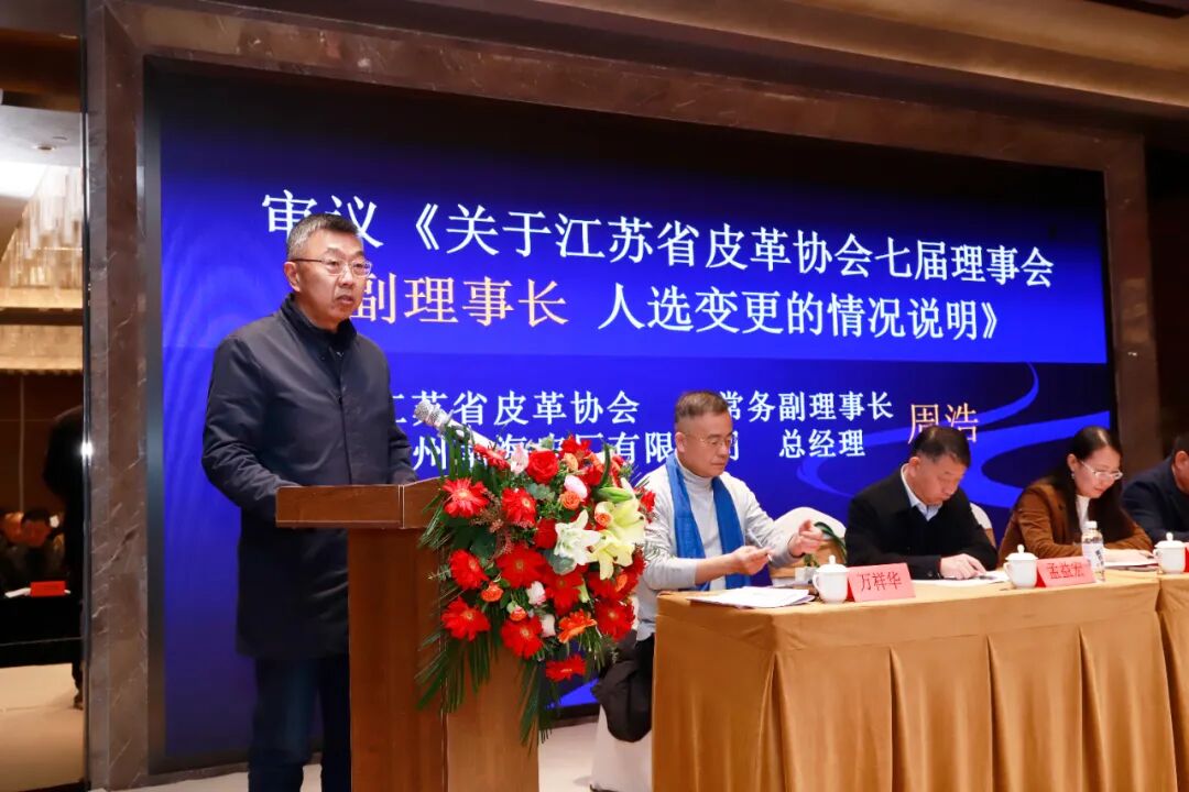 会议审议通过了协会常务副理事长、徐州南海皮厂有限公司总经理周浩先生宣读的《江苏省皮革协会七届理事会副理事长人选变更的情况说明》议案。