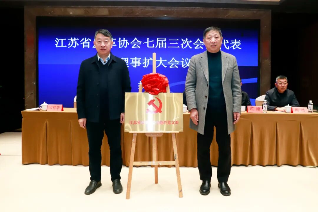 协会监事、丹阳市皮革鞋业商会党支部书记蒋国华宣读中共江苏省社会组织综合委员会【2025】77号文《关于同意成立江苏省皮革协会临时党支部的批复》。扬州大学广陵学院党委书记孟益宏、江苏新森达鞋业有限公司党委书记仇向东共同为“江苏省皮革协会功能性党支部”揭牌!