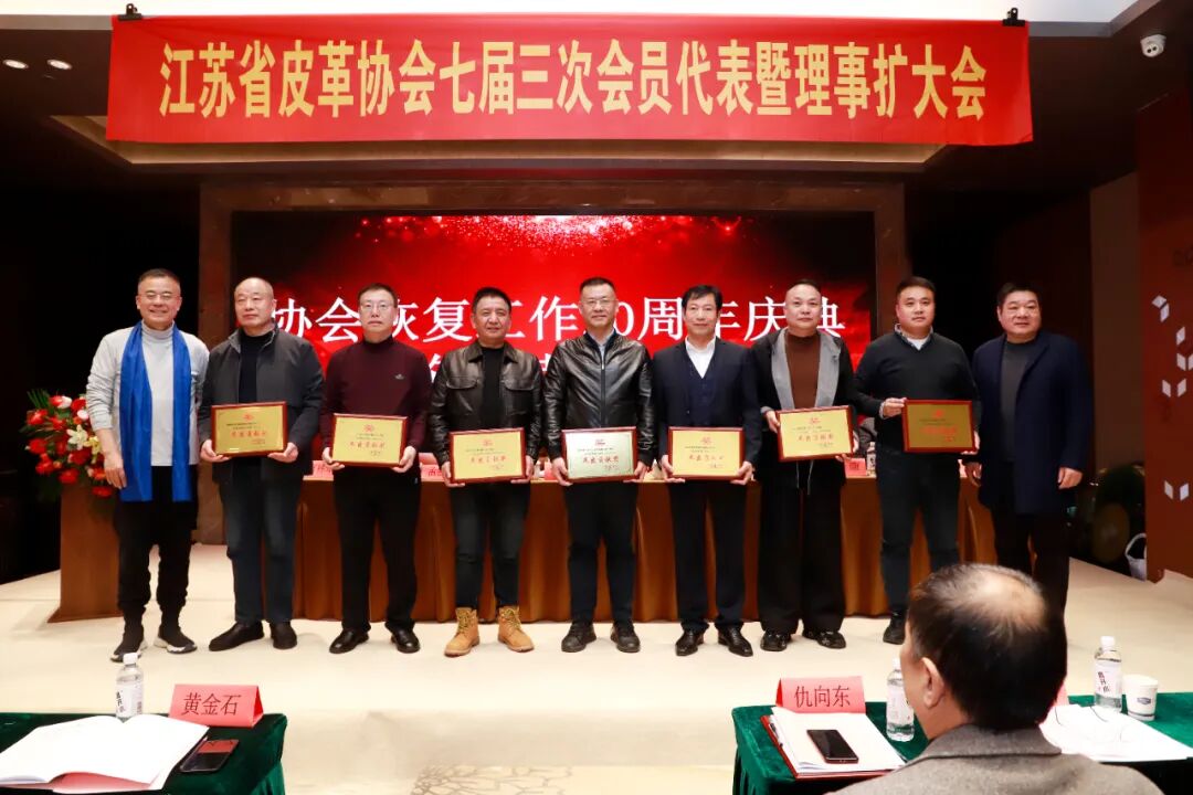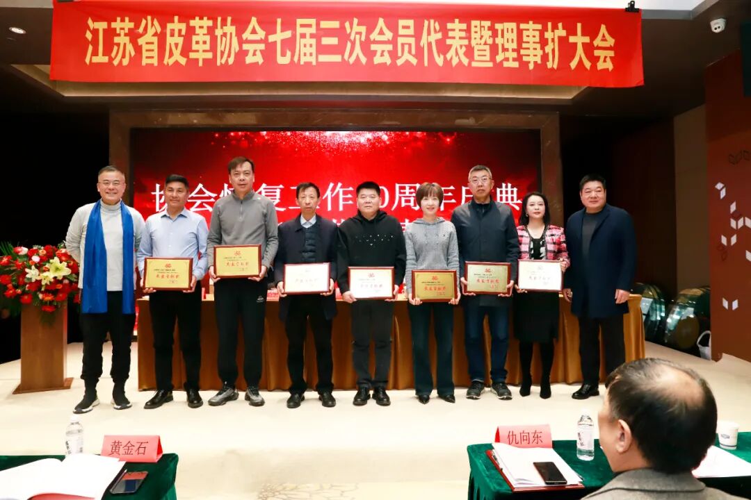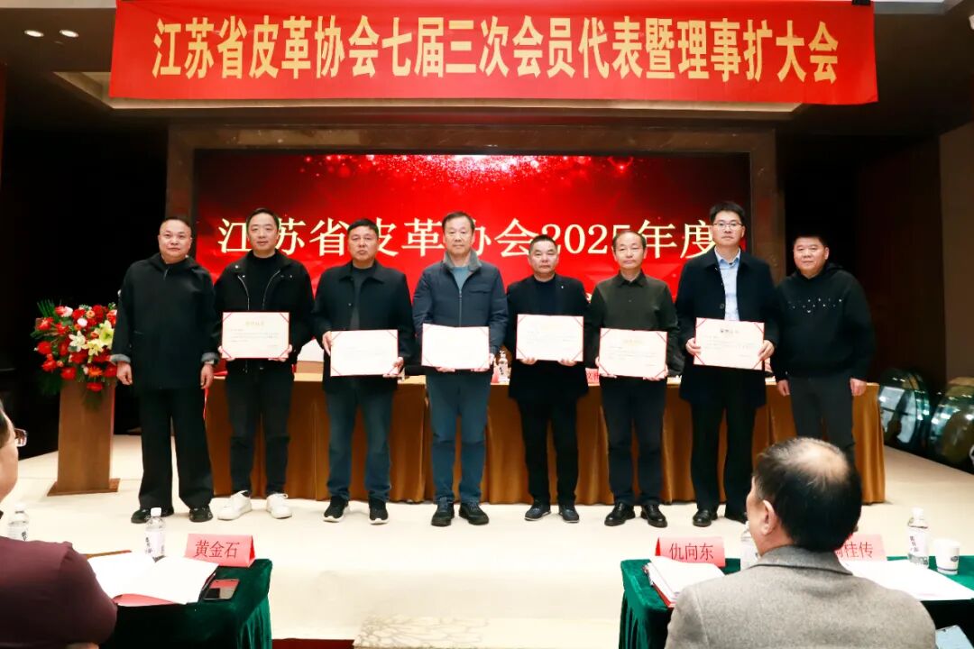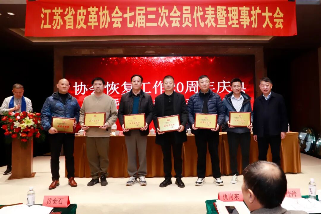 丹阳市皮革鞋业商会、丹阳市华翔鞋业有限公司、江苏周士达鞋业有限公司、镇江永乐裘皮制品有限公司、镇江爱可信皮业有限公司、江苏拿得劳鞋业有限公司、南京明璐鞋业有限公司、泰兴市平顺皮革制品有限公司、江苏奥晟企业发展有限公司、江苏创标检测技术服务有限公司、丹阳东方皮革城鞋业商会、扬州宾力文化传媒有限公司、江苏蒂莉爽足鞋业有限公司、丹阳市开鑫苹果鞋业有限公司、丹阳市千润鞋业有限公司、丹阳三九玫瑰鞋业有限公司、丹阳市加利利皮革商行、镇江锦顺鞋业有限公司、扬州市邗江鞋业商会19家单位获江苏省皮革协会恢复工作20周年(2005-2025)“优秀贡献奖”。协会常务副理事长孟益宏、万祥华、周浩为获奖单位颁奖!