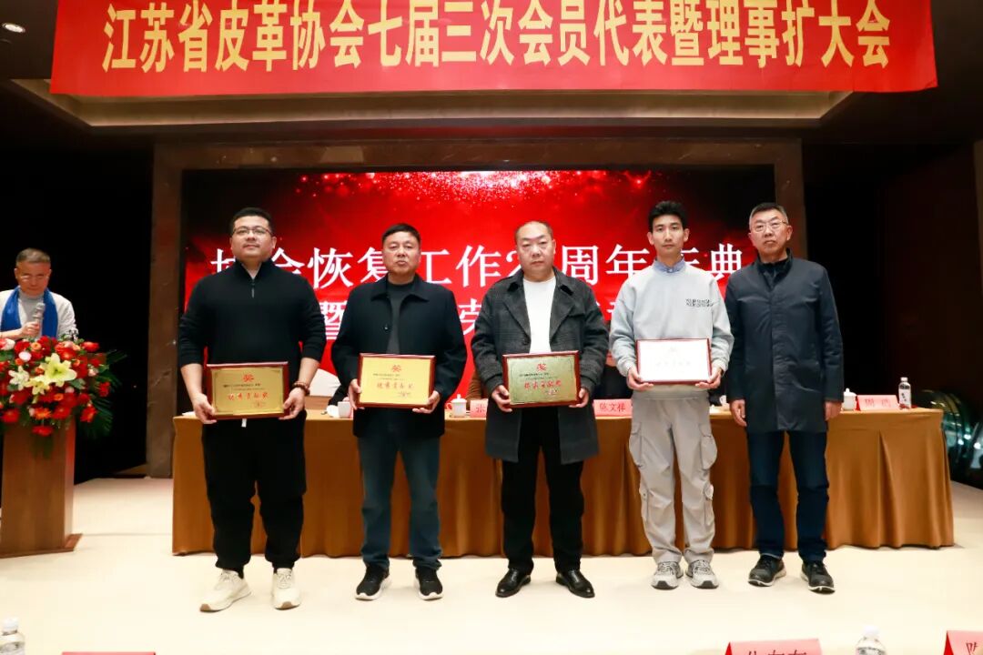 徐州南海皮厂有限公司、徐州千百度鞋业有限公司、江苏菱光鞋业有限公司、名雪鞋业(江苏)有限公司、江苏凯森鞋业有限公司、上海国学鞋楦有限公司、镇江旺达鞋业有限公司、禧玛诺(连云港)实业有限公司、淮安九龙鞋业有限公司、镇江德倪鞋业有限公司、徐州鸿丰高分子材料有限公司、扬州市邗江成功鞋业有限公司、徐州兴宁皮业有限公司、江苏伊贝实业股份有限公司、江苏企商投资管理有限公司15家单位获江苏省皮革协会恢复工作20周年(2005-2025)“杰出贡献奖”。江苏省皮革协会理事长陈文祥为获奖单位颁奖!