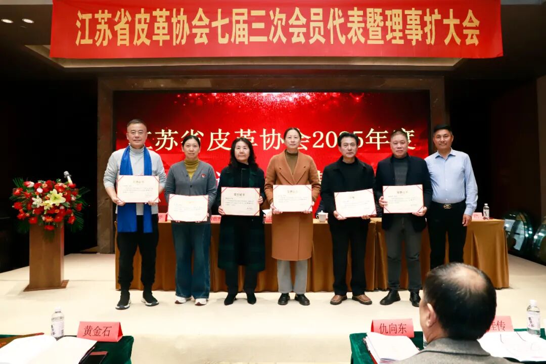 协会副理事长、镇江旺达鞋业有限公司董事长陶桂传宣读《关于表彰江苏省皮革协会2025年度“先进个人”的决定》,协会副理事长、丹阳市皮革鞋业商会会长景金毅,协会副理事长、扬州市江都区皮革协会会长陈景胜,协会副理事长、镇江丹徒区皮革裘皮鞋业商会会长黄忠明为获奖个人颁奖!